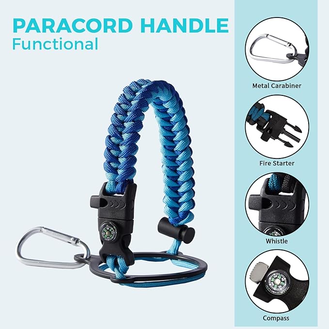- PERSONALIZATION BOTTLE PARACORD HANDLE - Thermo water bottle with a pretty cool functional paracord handle which does more than meets the eye. The survival strap cord made of military grade nylon, with compass, safety loop, metal carabiner, flint, igniter and whistle. Can help you out if you were in a survival situation while hiking, camping or everyday life