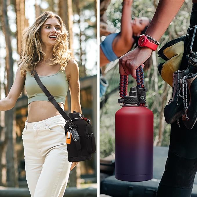 - SUPER DEAL COMBO - Buy one 64 oz insulated water bottle, get 9 accessories (2 x lids(BPA Free), 1 x paracord handle, 2 x straws(BPA Free), 1 x carrier bag, 1 x shoulder strap, 1 x protective silicone boot, 1 x straw brush)