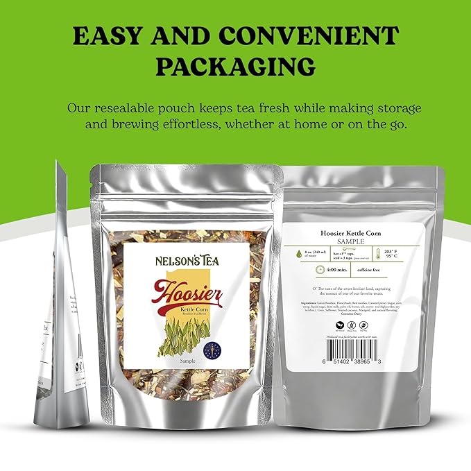 Nelson's Tea Hoosier Kettle Corn - Cut & Sifted, Caffeine Free Loose Leaf Tea with Sweet and Spicy Blend of Green Rooibos, Honeybush, Caramel, Corn, Safflower, Toasted Coconut, Marigold (Sample)