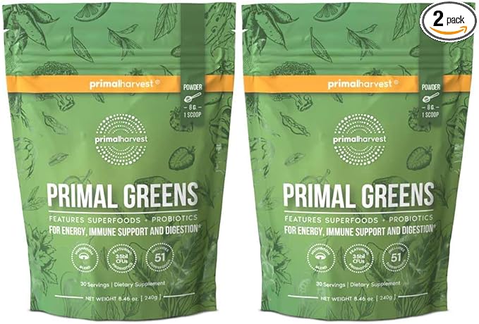 Primal Harvest Primal Greens Powder, 30 Servings Once Daily Supergeens Nutritional Supplement with Spirulina, Mushroom Blend & Probiotics to Support Energy, Wellness, & Digestion