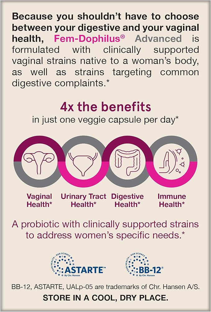 Jarrow Formulas Fem-Dophilus Advanced Vaginal & Digestive Probiotics 10 Billion CFU With 6 Clinically-Studied Strains, For Vaginal, Urinary Tract, Digestive & Immune Support, 30 Capsules, Shelf-Stable