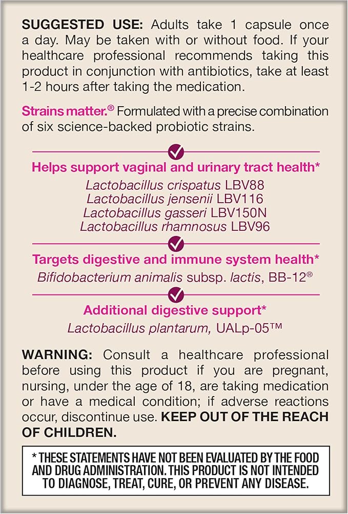 - Probiotic supplement with six science-backed strains to support vaginal, urinary tract, digestive and immune health.