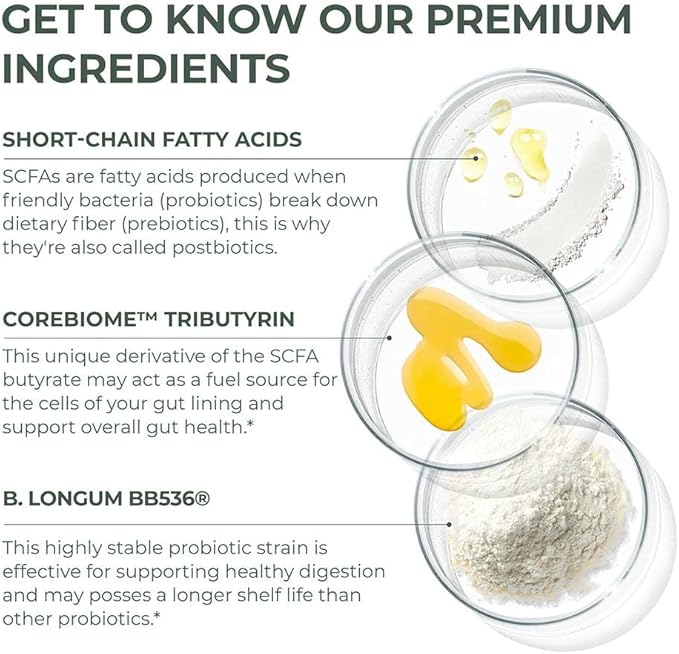- Holistic & Comprehensive Approach To Gut Health: Corebiome Tributyrin, Postbiotics, Prebiotics, and Probiotics offer a complete solution for help promote digestive health and overall gut function