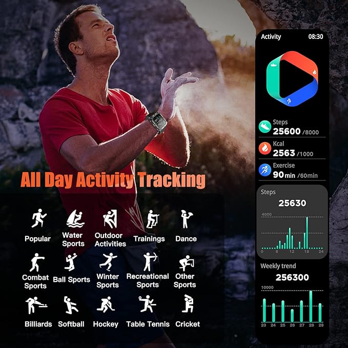- 【Activity Tracker with More Sports Modes】This Fitness smartwatch has 100+ sports modes,such as walking, running, cycling, sit-ups, yoga.The Exercise watches can also accurately record your steps, calories, distance, heart rate and detect your activity status in real time.It will give you more detailed insights into whole day activity.And it can help you analyze, improve and enhance your exercise capacity.