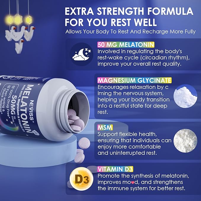 - ✔9-in-1 Extra Strength Formula for Rest & Recovery: Struggling with lower-dose melatonin that just doesn't work? Our high-potency 50mg formula is designed for those who need more. We go beyond melatonin with a 9-in-1 blend that includes Vitamin D3, Magnesium, Zinc, MSM, and cḁḷṃḭṇḡ herbs like Ashwagandha, Lemon Balm, Passionflower, and Chamomile. This powerhouse combination supports a natural rest cycle and a cḁḷṃ, comfortable body—ideal for recharging after long days, travel, or shift work.