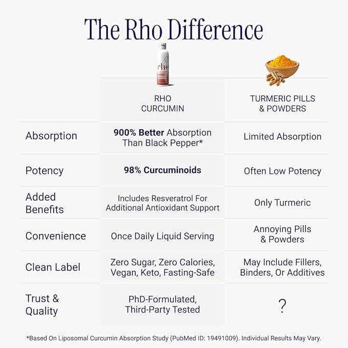 - 10X BETTER ABSORPTION: Liposomal technology encapsulates Curcumin and Resveratrol in tiny pouches similar to cell membranes, increasing bioavailability and absorption by up to 10X. Liposomal encapsulation enhances Curcumin absorption by at least 9-fold compared to supplements with black pepper extract (piperine). Rho bypasses the digestive system, ensuring superior absorption over traditional capsule, pill, and powder curcumin supplements prone to minimal absorption and potential side effects.
