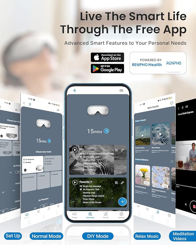 - App Control and Customized Features: This is the most advance smart eye massager to date. Take control of your relaxation by linking to Renpho Health App via Bluetooth, and you can also use the DIY mode and meditation music to meet your individual needs. Tailor your experience to your preferences, targeting massage areas that need it most and enjoy free calming music for full relaxation.