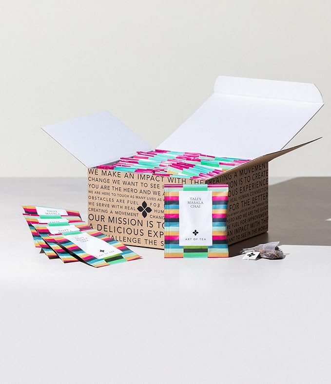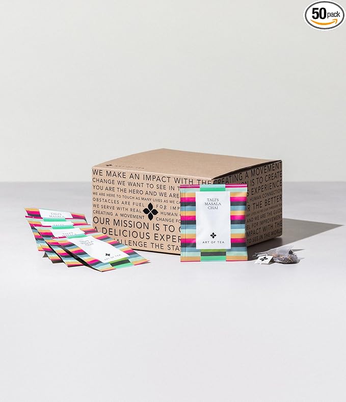- DELICIOUS EXPERIENCE – Find your new favorite with this tea bulk pack from Art of Tea! Includes 50 tea sachets of Organic Talis Masala Chai Tea. A chai tea blend above all others. Talis Masala Chai is a black chai tea fusion of organic Assam tea anchored in cardamom, cinnamon, ginger, and other spices for a balanced aromatic black tea blend. With round and savory notes, this chai masala tea is certain to delight all your senses.