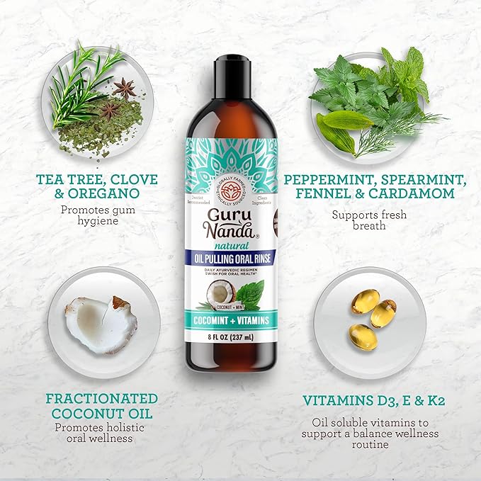 - GuruNanda Pulling Oil Mouthwash is a natural, pre-brush rinse inspired by Ayurvedic wisdom. It comes with three 8 fl oz bottles & includes three tongue scraper and two butter on gums toothbrushes