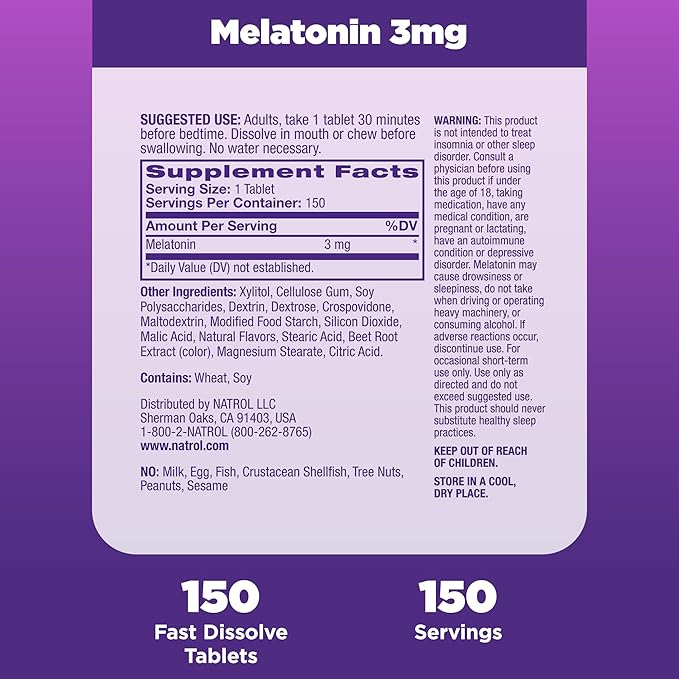 - Sleep Support Supplement: Contains one 150 count bottle of Natrol Melatonin 3mg Strawberry-Flavored, Fast-Dissolve Tablets for a 150-day supply