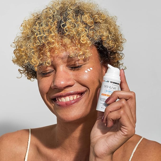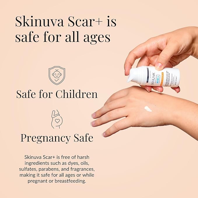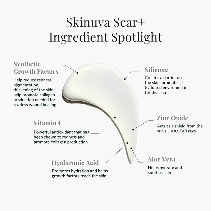 - Premium Sun Protection: Skinuva Scar+ has been specifically formulated for areas exposed to the sun, such as the face, neck, and hands, to minimize the darkening effects associated with sun exposure and help reduce the appearance of redness and hyperpigmentation. Additional ingredients include hyaluronic acid, aloe, centella asiatica, vitamin C, and silicone cream.