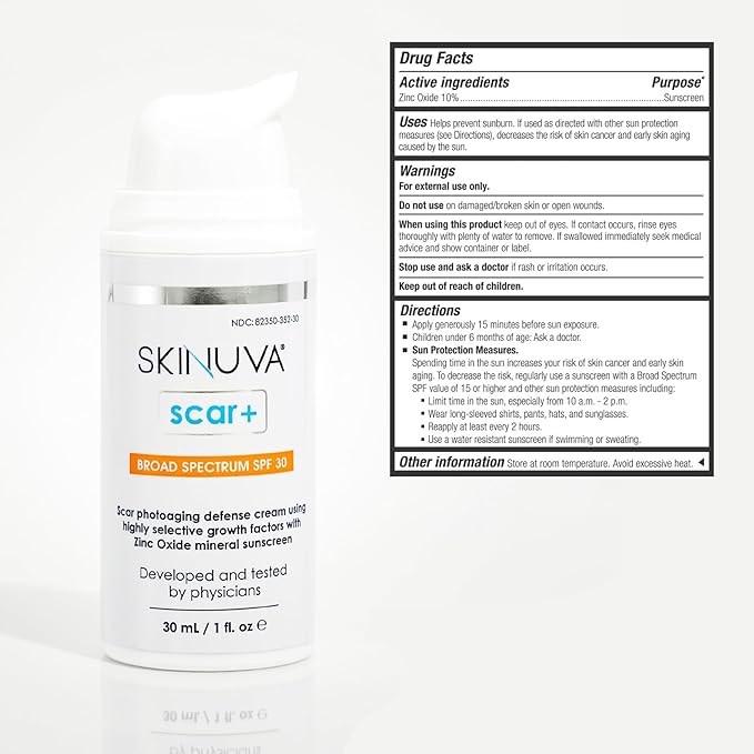 - Advanced Scar Therapy: Skinuva Scar+ Cream SPF 30 has all the benefits of the original silicone scar cream matrix formulated with growth factors, but with added non-nano Zinc Oxide for broad spectrum UVA/UVB sunscreen protection. These selective Growth Factors help reduce the appearance of redness, pigmentation, and thickening of the skin; helps promote collagen production needed for scarless wound healing.