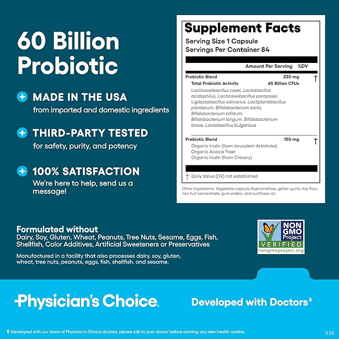 Physician's CHOICE Probiotics 60 Billion CFU - 10 Strains + Organic Prebiotics - Immune, Digestive & Gut Health - Supports Occasional Constipation, Diarrhea, Gas & Bloating - for Women & Men - 84ct