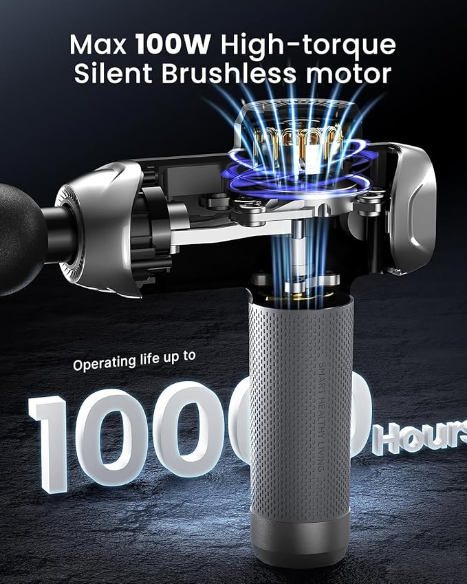 - Powerful Massage Gun Deep Tissue - Equipped with a high-torque brushless motor with 12MM amplitude, the massager gun can deliver up to 45lbs massage intensity to relieve your muscle and fascia tissue soreness.