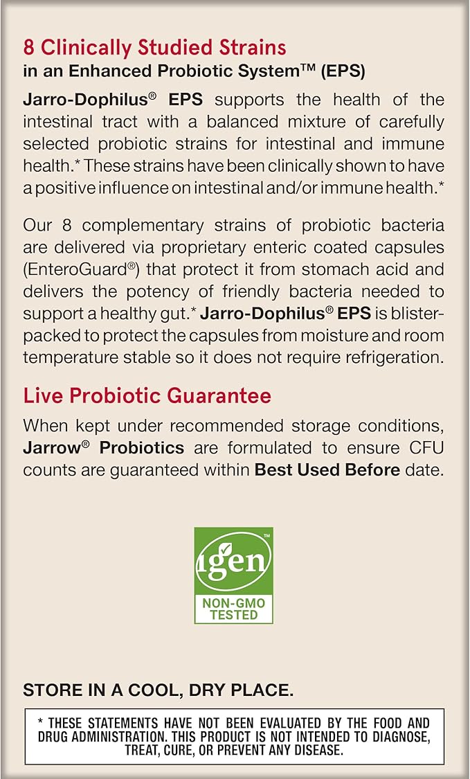- PROBIOTICS FOR GUT HEALTH: Jarrow Formulas Jarro-Dophilus EPS probiotics supplement helps support immune health and the development of a healthy gut(1)