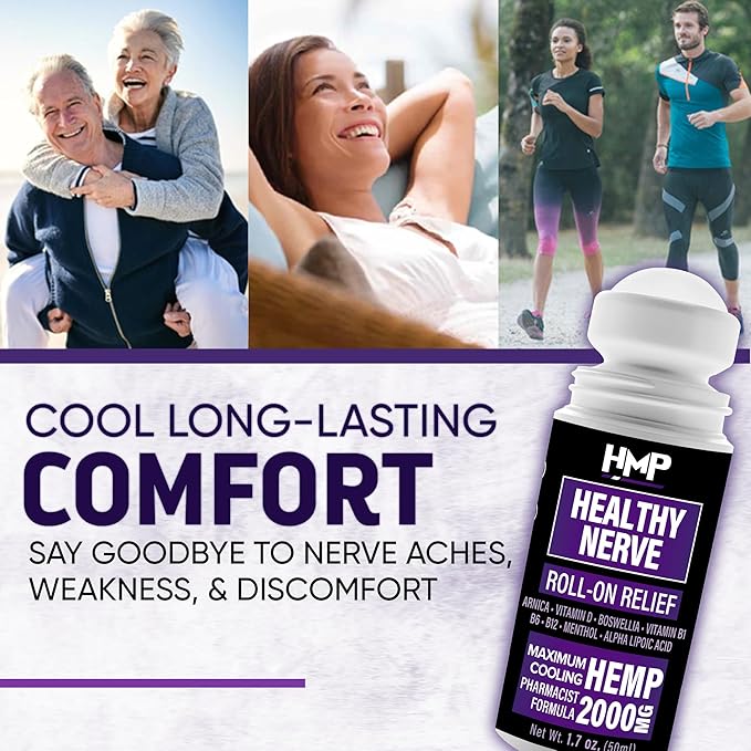 Neuropathy Nerve Pain Support Roll-on Hemp Cream 2000mg Maximum Strength Relief for Back, Neck, Shoulder, Legs, Feet. Natural Arnica, Boswellia, Vitamin D3 B1 B6 B12 + Menthol, Made in USA 1.7 oz