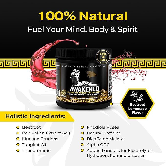 Awakened Natural Pre Workout Powder 12-in-1 | Conscious Energizer | Bee Pollen + N.O. Booster | Mucuna Pruriens, Tongkat Ali, Rhodiola, Alpha GPC & Trace Minerals | Spartan Bee Bread Brand, 40SV