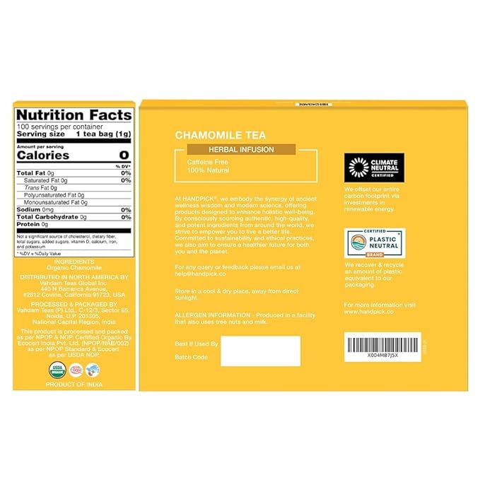 HANDPICK, Organic Chamomile Tea Bags (100 Herbal Tea Bags) Caffeine Free| Premium Floral Chamomile Herbal Tea in Eco-Conscious Teabags | Direct from Source