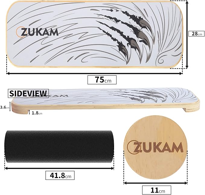 - [What’s included] - The Zukam Balance Board comes with board, roller and workout guide. The board measures 75x28cm , and the roller has a diameter of 11cm and a length of 41.8cm.