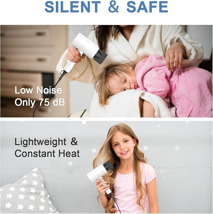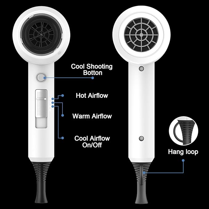 - Powerful Motor for Faster Drying: The professional hair dryer delivers strong wind for fast drying even thick wavy hair in less time, because of the high airflow motor, up to 21,000 rpm. Compact design will be more lightweight & portable.