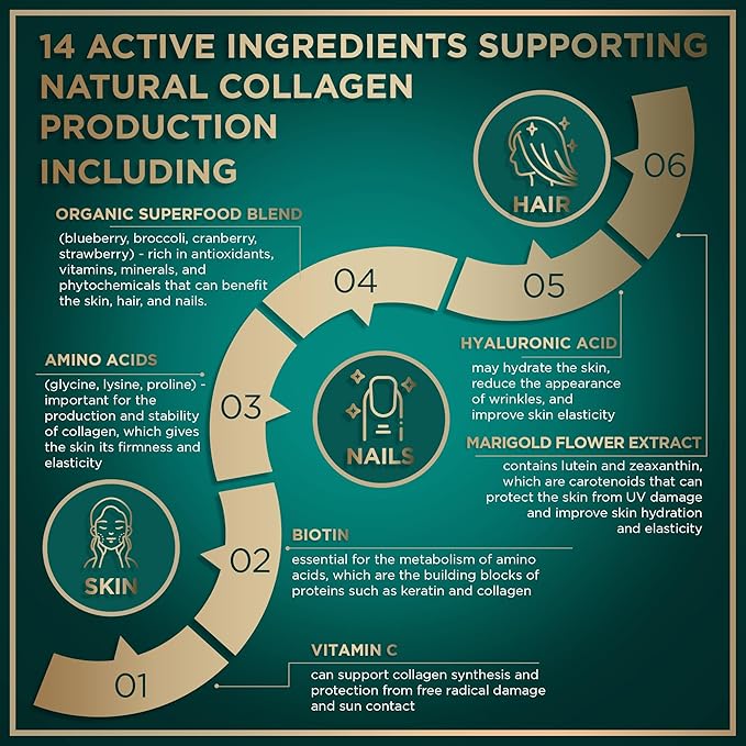 - VEGAN, ORGANIC SUPERFOOD CAPSULES. Collagen is the main building block in your body. Plant based vegan vegetarian collagen hair and nail vitamins for clear conscience aging defense for women and men.