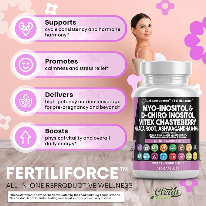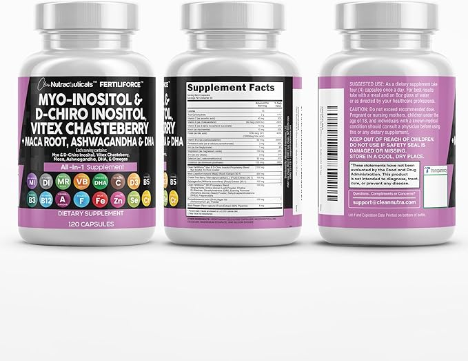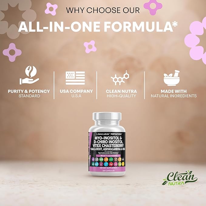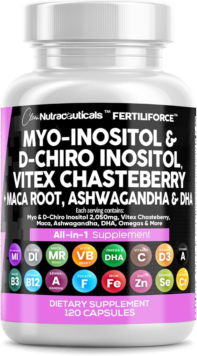 Clean Nutraceuticals Myo-Inositol & D-Chiro Inositol 2050mg Fertility Supplement 40:1 Ratio - Prenatal Vitamins for Women with Ashwagandha Maca Root Vitex Chasteberry Iron DHA Folic Acid DIM Zinc (1)