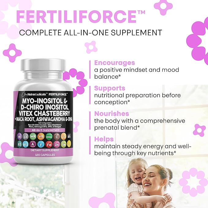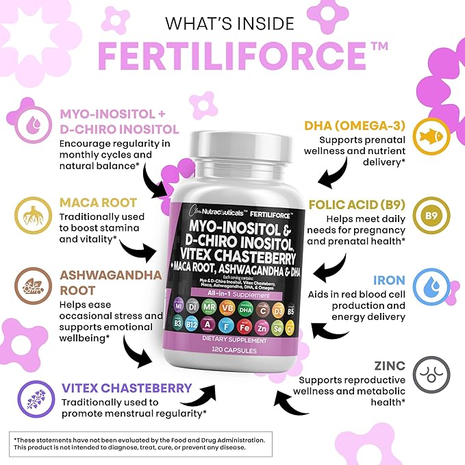 - COMPREHENSIVE FORMULA: Potent blend of Myo-Inositol, D-Chiro Inositol, Vitex Chasteberry, Maca Root, Ashwagandha, and DHA to support overall health.