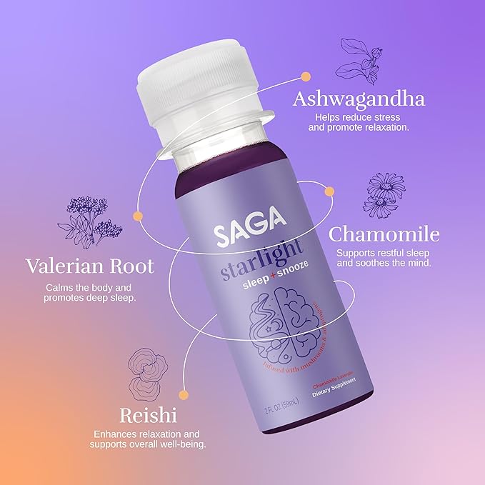 SAGA Starlight Organic Sleep Shots – 2oz Natural Sleep Aid with Melatonin, Reishi, Valerian Root, Ashwagandha, Chamomile – Sugar-Free, Zero Calories, Mushroom Drink