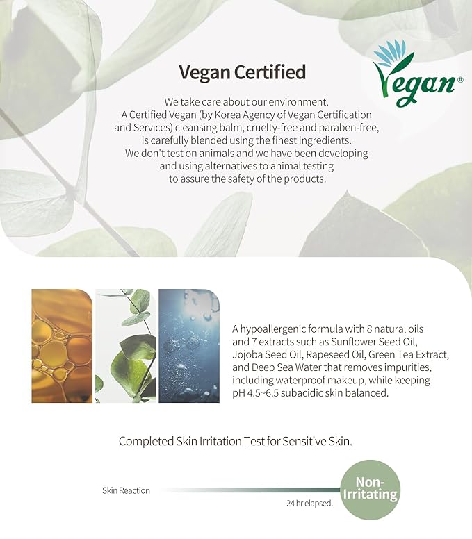 - [Vegan Certified / Hypoallergenic with Natural Ingredients] Absolutely Vegan Certified by Korea Agency of Vegan Certification and Services. A hypoallergenic formula with 8 natural oils and 7 extracts such as Sunflower Seed Oil, Jojoba Seed Oil, Rapeseed Oil, Green Tea Extract, and Deep-Sea Water that removes impurities, including waterproof makeup, while keeping pH 4.5~6.5 sub acidic skin balanced.