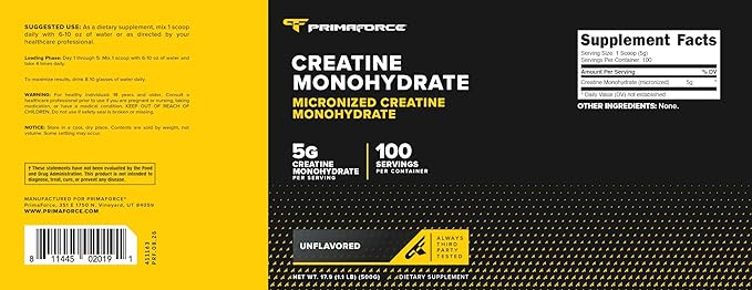 Primaforce Micronized Creatine Monohydrate Powder 500 Grams (1.1 Pounds)