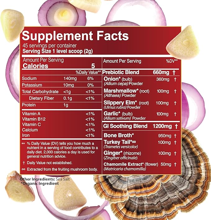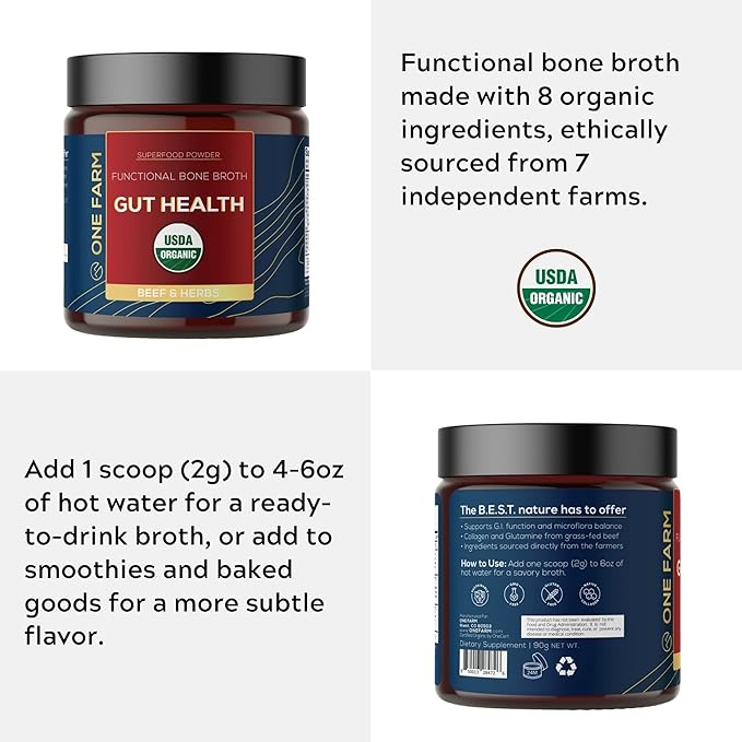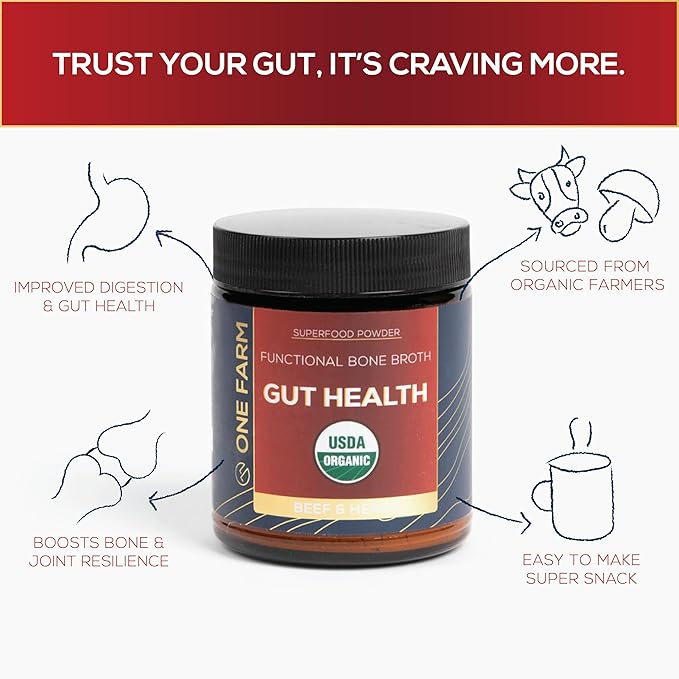 One Farm Superfood Powder Gut Health, Organic Gut Soothing Blend and Prebiotic Blend, Non-GMO, Prebiotics with Bone Broth, Turkey Tail Mushroom, Slippery Elm, and Marshmallow Root for GI Health