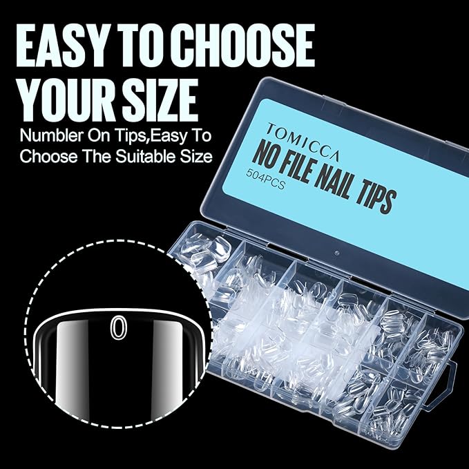 - MULTIPLE SIZES AND NAIL TYPES: TOMICCA offers 504Pcs of artificial nail tips in 12 different sizes. Suitable for most finger needs. Each false nail tip is individually numbered, so you're sure to find a full nail tips that fits your natural nails.