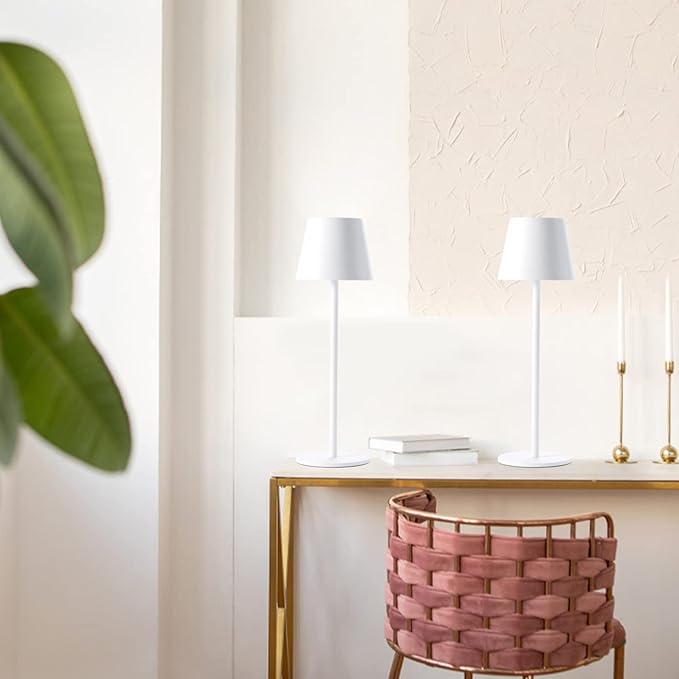 Maksone 2 Pack LED Cordless Table Lamp, 6600mWh Rechargeable Battery Desk Lamp, 3000K Stepless Dimming Night Light, IP54 Waterproof Metal Outdoor Portable Lamp for Camping, Restaurant (White)