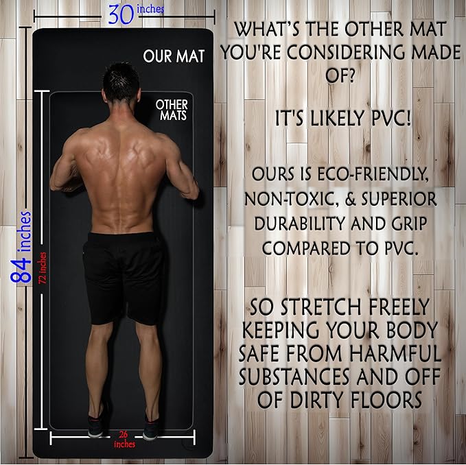 - An Extra Long Yoga Mat for Unrestricted Practice—Our long and extra wide yoga mat ensures superior comfort and joint support, allowing you to practice without constraints and without worrying about your hands, feet, or face touching unsanitary floors. Stop limiting yourself with standard