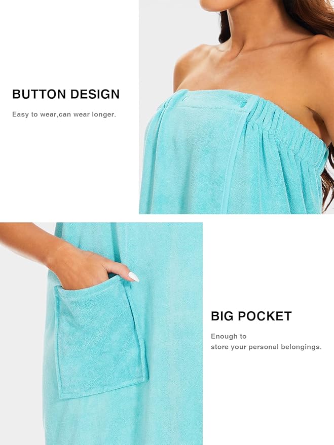 • Intimate Design: The terry cloth robe for women wrap bath has a snap closure design that makes it easy to put on and take off. The back of the spa towel wrap is designed with elastic bands to make you comfortable to wear.And there is a big pocket on the terry cloth spa bath wrap, which can hold mobile phones or cosmetics, etc.Which provides you with more convenience.