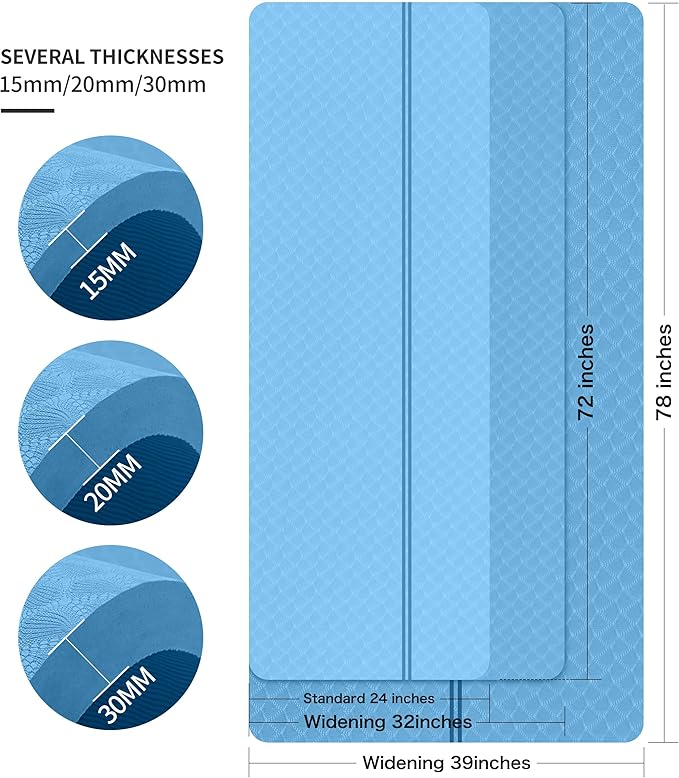 - ๐นEXTRA LONG EXTRA WIDE: nuveti's 72"x32"/78"x36" offers adequate space to fit any type of exercise like yoga, pilates, bikram, and fitness exercise.Most yoga mats on the market are 6mm, 8mm or even thinner. This yoga mat is thickened to 15mm,20mm,30mm which can provide more support and protection for your ankle, knees, joints, and body on hard floors, as well as absorbs vibration and reduces noise.