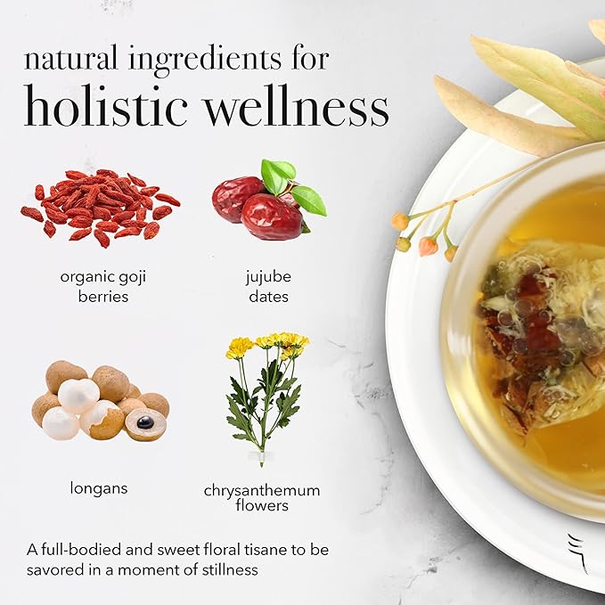 qìsane Chrysanthemum Tea Bags with Organic Dried Goji Berries - Dried Chrysanthemum Flowers, Dried Longan Fruit & Jujube Dates - Herbal Tea to Support Calmness & Well-Being - 10 sachets (~30 cups)