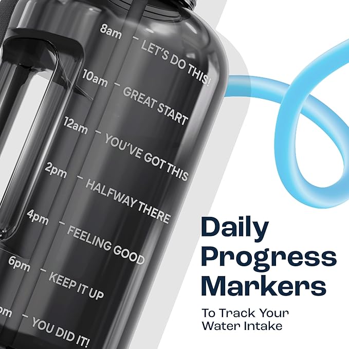 - Track how much you drink - Our BPA Free one gallon water bottle comes with time markers on the side so you can see your daily water intake and stay on track meet your health and fitness goals.