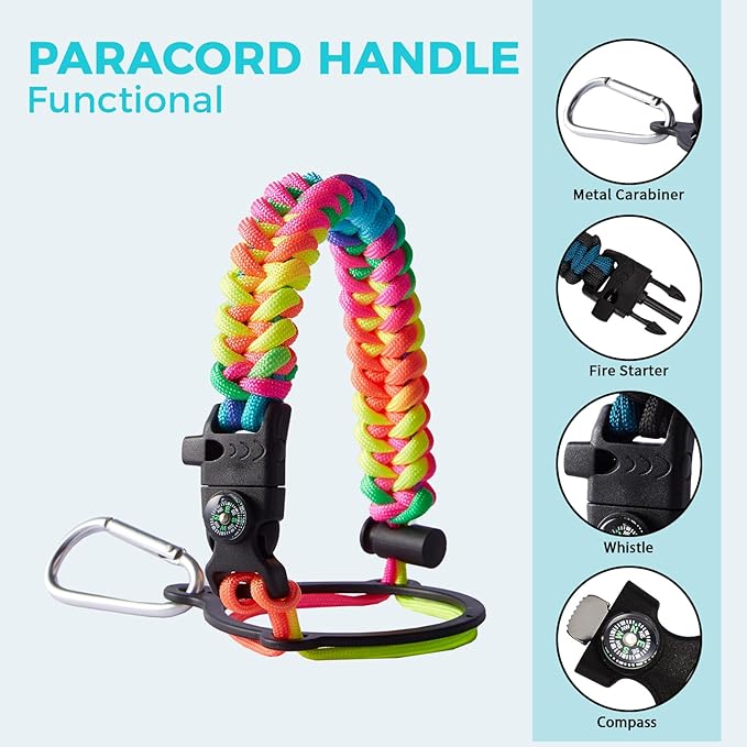 - PERSONALIZATION BOTTLE PARACORD HANDLE - Thermo water bottle with a pretty cool functional paracord handle which does more than meets the eye. The survival strap cord made of military grade nylon, with compass, safety loop, metal carabiner, flint, igniter and whistle. Can help you out if you were in a survival situation while hiking, camping or everyday life
