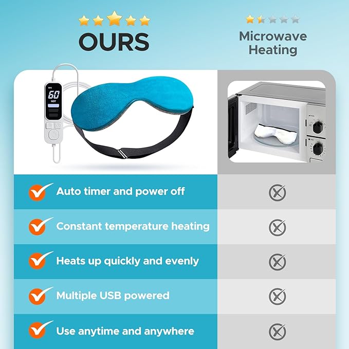 - Far-infrared Heat Relieves Eye Discomfort: Our heated eye mask uses far infrared heating technology to generate heat quickly, increase oil secretion, effectively relieve dry eyes, eye fatigue, sinus migraine, dark circles, blepharitis, stye, puffiness, and MGD, and provide ultra comfy hot for your eyes.