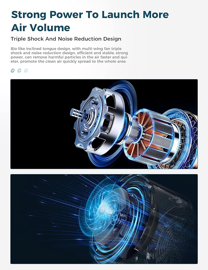 - Boosted Power for Greater Air Flow: With a bio-inspired inclined tongue design and a triple shock and noise reduction multi-wing fan, this air purifier boasts strong and efficient power to quickly and quietly reduce harmful particles from the air, promoting clean air to rapidly spread throughout the whole area.