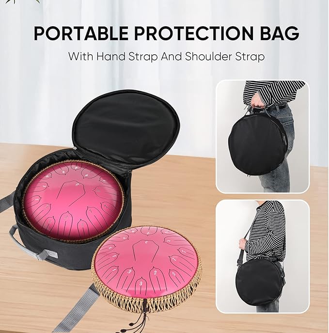 - Easy to Play and Carry: Steel drum has different ways to play, you can use the drumsticks and finger picks to play, and use your fingers to play directly; Tank drum can be used for different musical expressions; Steel tongue drum comes with music book, mallets and shoulder strap carrying bag, which is lightweight and convenient to carry to various place