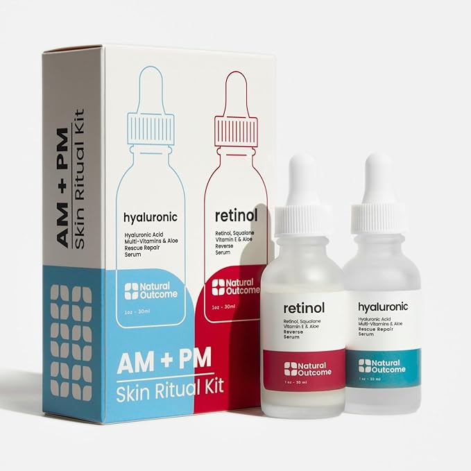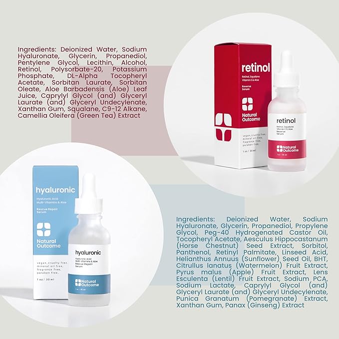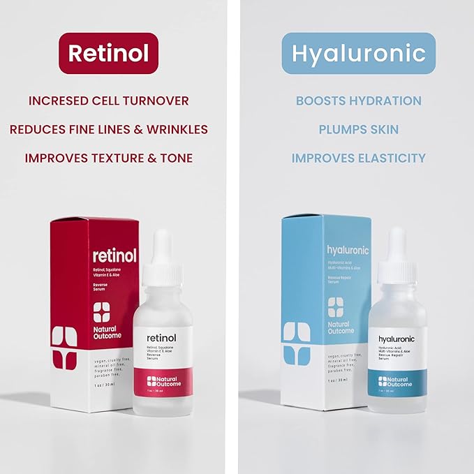 Natural Outcome Hydrating Hyaluronic Acid Serum and Retinol Facial Serum - Night and Day Anti Aging Facial Serum Set 1 oz Each, Vegan, Cruelty Free & Fragrance Free