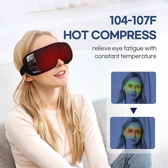 - 【Comfortable Heating Massage】HubiCare eye massager built-in heating pads provide a comfortable temperature between 104 and 107 degrees Fahrenheit(40℃-42℃), better for relaxing eye puffiness, dry eyes, etc. A hot compress can regulate the metabolism of the eyes, more effectively improve symptoms such as dry eyes, and reduce dark circles. Note 1: We do not recommend customers use eye machines if they have undergone eye operation, retina condition, cataract, glaucoma, etc.