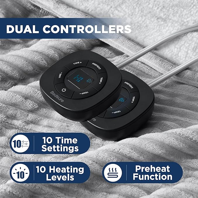 - Customizable Warmth: Featuring fast and consistent heating, this electric blanket offers 10 heating levels and 10 time-settings with preheat function for customizable coziness. Powered by advanced heating wire technology and equipped with dual controllers, it can precisely control temperature, ensuring safer warmth
