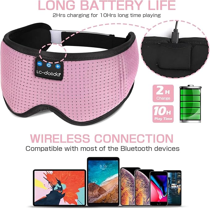 - 【Perfectly Block Out Light & Wireless Connection】LC-dolida Sleep headphones sleep mask with bluetooth headphones has a full coverage and unique nose area design, it can effectively block out light, prevent light leakage and makes your sleep better, Get the benefits of total blackout, whether at home, in a hotel or on the plane. The breathable, fibers of hypoallergenic material allows healthy oxygen in while keeping dry air out, which make you fall asleep faster