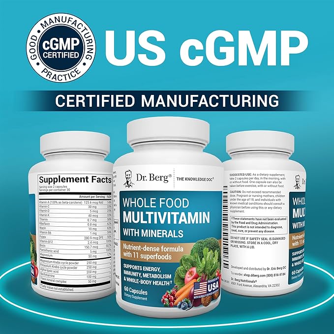 Dr. Berg Whole Food Multivitamin with Minerals - Daily Multivitamin for Men and Women - Includes Premium Whole Food Fruits and Vegetable Blend with Folate, Alpha-lipoic Acid and More - 60 Capsules