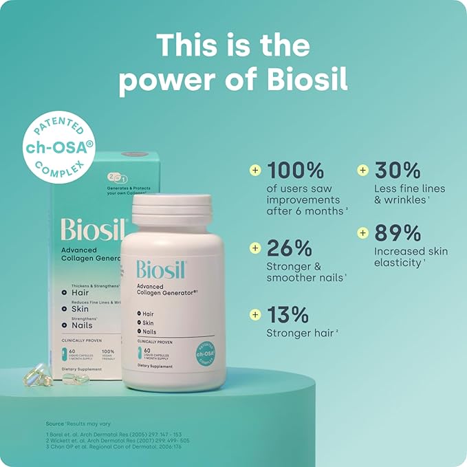 - ACTIVATE YOUR BEAUTY - The ch-OSA in Biosil Collagen Generator increases collagen, keratin, and elastin levels in your body. The result? Less wrinkles, glowing skin, luscious hair, and seriously strong nails.