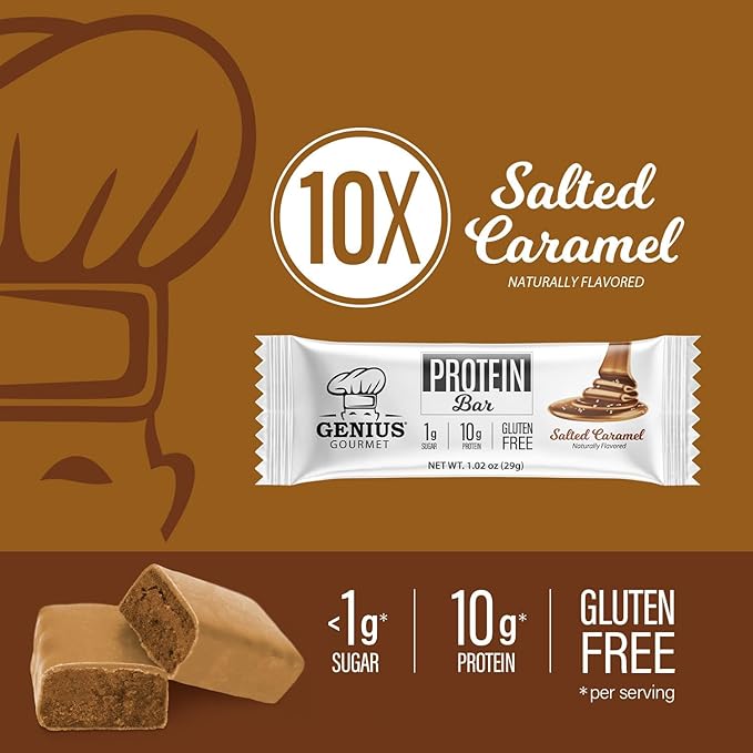 Genius Gourmet Protein Bar, Salted Caramel Keto Snack, Low Carb, Low Sugar & Gluten Free, Protein Snacks for Adults, 10G of Whey Protein per Protein Bar, 5 Net Carbs, 10 Count