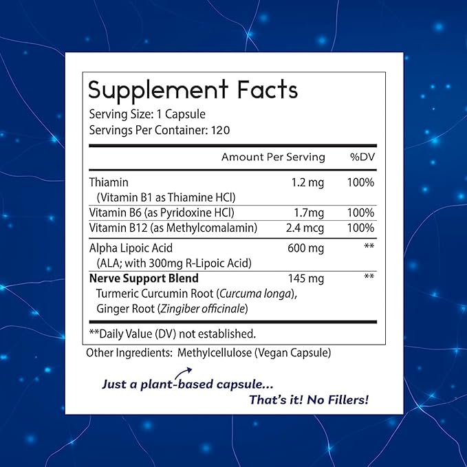 - With Vitamin B Complex: Our alpha lipoic acid 600mg capsules are a powerful nerve support blend, with vitamins B1 (thiamine), B6 (pyridoxine), and B12 (methylcobalamin) known as neurotropic vitamins and help with the smooth functioning of the nervous system.